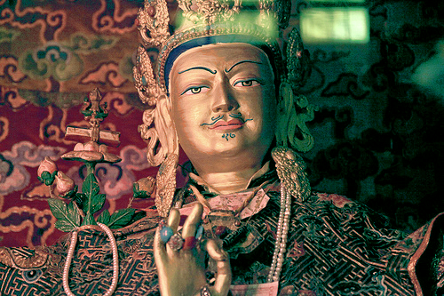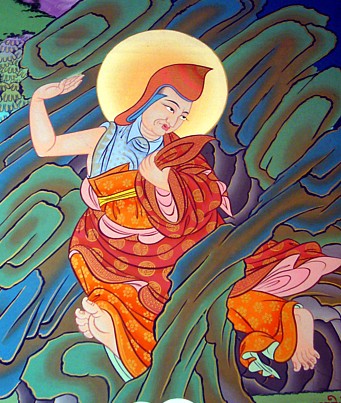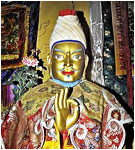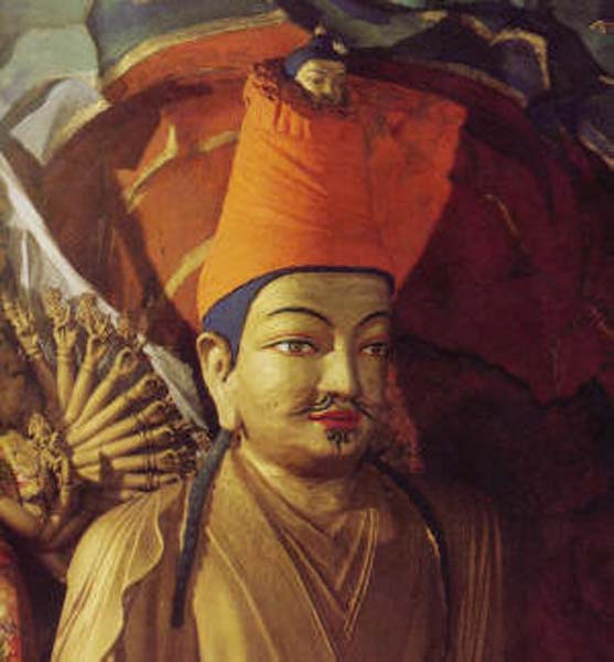 THE GOLDEN ROSARY OF THE KAGYU Reviewing the lives of our lineage ancestors, by In the beginning, the land we know today as Tibet was not a united country, but a collection of petty kingdoms ruled by disparate local chieftans. The first recorded king was Nyatri Tsenpo », who appeared in the 4th century BC -- according to some stories as a wanderer from India, according to others, having descended from the heavens on a rope ladder. But it was not until the reign of Lha Thotori Nyentsen in the third century AD -- 233 AD, to be exact -- that we encounter the first suggestion of Buddhism entering Tibet. For it was then that a set of Buddhist objects known as “The Secret Antidotes” was said to have been found on the roof of the king's palace, having supposedly been blown there by a wind which carried them from the roof of an Indian king's residence. This collection included a silver stupa, a royal seal, and several religious scriptures written in an Indian dialect. Another, less exalted version of the tale suggests that these objects were in fact brought to Tibet by a Nepalese translator/scholar. Either way, as written Tibetan was at that time rudimentary, it was not possible to translate and record the texts then and there. Rather, as one prediction had it, they would be deciphered by one of the king's descendants within five generations. Still, Lha Thotori is traditionally credited with introducing the Dharma to Tibet, and indeed so paramount was the arrival of the sacred objects considered that the dating system for all Tibetan currency until the Communist Chinese invasion was based on the designation of 233 AD as Year One. It was indeed five generations later, with the appearance of King Songtsen Gampo », that the Dharma gained a solid foothold in Tibet. To understand the pre-eminent place held by this ruler we must understand the mystic bond that has existed primordially between the Tibetan people and the Bodhisattva of Boundless Compassion, Avalokiteshvara (Tib: Chenrezig). This bond has proven inalienable, even after the past fifty years of Communist occupation. Indeed, one version of Tibetan pre-history states that Avalokiteshvara had such compassion that he emanated in the land of Tibet as a monkey who, by uniting with a lustful rock ogress, was able not only to ease her karmic sufferings, but become, with her, the progenitor of the Tibetan people. It is therefore not hard to see why, retrospectively, the Tibetans look upon their seventh century ruler, Songtsen Gampo, as another emanation of Chenrezig, for he was the most active propagator of the Dharma to have appeared to that date. He achieved this mission in several ways: first, he sent one of his chief ministers, Thonmi Sambhota, along with a number of scholar students, to India to study the art of writing. With the help of Kashmiri pandits the group learned a dialect from which they devised the Tibetan alphabet. Thereafter, it was only a matter of time before Indian Dharma texts were being translated into Tibetan as rapidly as scholars could churn them out. This endeavor was to prove inestimably valuable, not only to Tibetans but to Indians as well,for soon the Muslim invasion would see the destruction of many sacred Buddhist texts in the land of their origin. Second, Songtsen's choice of wives also helped the Dharma flourish. Just as the king was considered an emanation of the Bodhisattva of Compassion, so were his principal wives -- one Nepalese, the other Chinese -- seen as emanations of the goddess Tara,Chenrezig's female counterpart. Further, each brought with her as part of her dowry a Buddha image having the power to transform the energy and karma not only of the area where it was placed and the people living there, but of the entire planet. Finally, Songtsen made his people abide by the Dharma, among other things holding them to the laws of the ten virtuous actions. He also hid many treasures of both a material and Dharmic nature, thus enriching the land and -- allegedly -- protecting it against foreign invasion. Lest it be thought, however, that Songtsen Gampo manifested only kindness and compassion, it is also a fact that he had a significant shadow side. For this king was definitely expansionist, and indeed Tibet under his rule was considered a rogue superpower. Its vast armies managed to overrun most of Asia, including India, Ladakh, Nepal, Sikkim, Bhutan and Burma. And when the Chinese emperor defaulted on what amounts to “protection money” (it took the form of a promised fifty thousand bolts of silk annually), 200,000 Tibetan troops occupied the Chinese capital of Chang'an -- no mean feat, for this city was at the time the largest in the world, and three times the size of Rome! These events put current Chinese-Tibet relations into something of a perspective. Is the occupation of Tibet perhaps a karmic kickback stemming from what happened centuries ago? Certainly, HH Dalai Lama has stated that Tibet's position today is attributable to karma -- whether because of Songtsen Gampo's actions or for other reasons it is impossible for ordinary beings to gauge. Whatever the case, Songtsen Gampo kept a firm grip on Tibet until his death at the age of 82, which event is recounted from two different perspectives: if one embraces a metaphoric view of history, one can accept the version stating that at the age of 82 the king sat, in company with his Nepalese and Chinese wives, in front of an eleven-faced statue of Avalokiteshvara into which he dissolved. A more prosaic version suggests that Songtsen, while out one day hunting yak, died after drinking very cold water on top of a bountiful meal. Whether the meat was tainted or the cold water proved too great a shock for the king's system is anyone's guess, but we do know that his reign came to an end around 650 AD. According to the 14th century text, The Clear Mirror on Royal Genealogy, the king's last words to his people were: “Reject mundane actions and practice the 