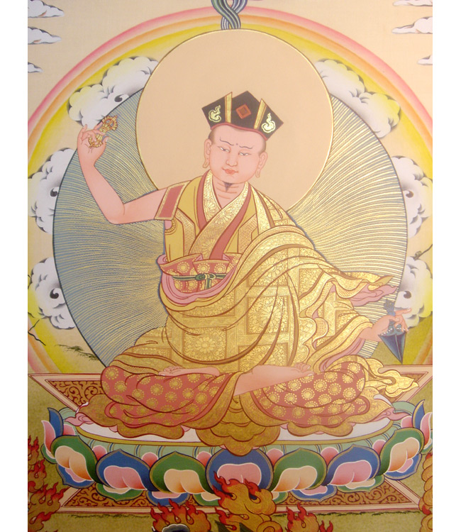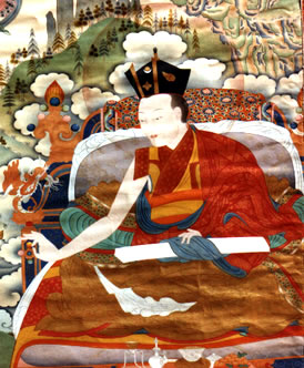 THE GOLDEN ROSARY OF THE KAGYU Reviewing the lives of our lineage ancestors, by The Karmapas In a Sutra the Buddha predicted that about 1600 years after his own death a "Man of Action" (Tibetan: Karmapa) would spread the Dharma through a lineage extending far into the future. When U Se, whom we've already mentioned as a student of Gampopa, arrived at the latter's monastery around 1140, Gampopa recognized him as the embodiment of that man. Even before that meeting, U Se, later known as Dusum Khyenpa » (Knower of the Three Times), was so advanced a practitioner that he could pass through solid rocks and mountains. Here, it is important to note that all Karmapas are considered emanations rather than reincarnations, the difference being that whereas reincarnation implies a conscious decision -- hence, a sense of an "I", however subtle -- an emanation is one hundred percent spontaneous, without ego or delay, like the rays emanating from the sun. One could say that Karmapa is a cosmic principle taking on human form, rather than a human being as we conventionally know them. Under Gampopa the Karmapa trained in the Khadampa tradition of Atisha, blended with the Mahamudra instructions of the Kagyu. He ultimately traveled and taught throughout Tibet, achieving enlightenment at age fifty while practicing Dream Yoga. Here we should examine the history of the Black Vajra Crown which, along with its accompanying ceremony, is one of the Karmapa's specialties. The legend begins in a time prior to recorded history when an emanation of Avalokiteshvara (a pre-emanation, so to speak, of Dusum Khyenpa) took on the form of a Central Asian prince. After years of solitary retreat, this prince was presented with a subtle crown, visible only to those of pure karma, woven from the hair of myriad Dakinis. Later, within recorded history, Dusum Khyenpa had a vision of Dakinis offering him this same crown. Thereafter, this crown appeared mystically above the heads of all succeeding Karmapas, but again could not be seen by ordinary beings. During the time of the Fifth Karmapa (15th century) the Chinese Emperor, Yung Lo, being a bodhisattva, could see the crown and was saddened that others could not. He therefore asked the Karmapa if he could have a replica made so all beings would beneft. The Karmapa agreed, and it was ever after considered that the mere sight of the crown had the power to liberate the viewer. We will speak more of the accompanying Black Crown ceremony when we come to the life of the Fifth Karmapa. For now, suffice it to say that at the age of eighty the first Karmapa established his seat at Tsurphu in Central Tibet, where his monastery continues to this day, although the current Karmapa has fled the Communist Chinese occupiers and is now residing in India. Dusum Khyenpa is also famous as the first being to predict his own re-emanation, thus becoming the official founder of the tulku system. Obviously, emanations and reincarnations existed long before even the appearance of Shakyamuni Buddha, but only with the Karmapa was it made official. The prediction letter was entrusted to Karmapa's chief disciple, Drogon Rechen, who was himself an early manifestation of what would later be dubbed the Tai Situ line. Dusum Khyenpa passed away at age 84, and when his funeral pyre was opened it was discovered that (as with the XVI Karmapa of our own time) some of his bones bore clear self-manifesting Buddha images. Karmapa II Karma Pakshi » was born in the 13th century into a family that was descended from the great Tibetan king, Trisong Deutsen. He was discovered according to the indications in his predecessor's letter, and was a man of many miracles. This Karmapa was invited to China by the Mongol prince, Kublai Khan, but did not stay long because the Sakyapa, who had been established in China by Sakya Pandita, resented the Kagyu master's presence and popularity. Karma Pakshi's departure to forestall sectarian violence offended Kublai who, upon later hearing that Karmapa was within his borders, sent an army of thirty thousand soldiers to arrest him. But though they tried to tie him up, Karmapa's body was like a rainbow and could not be confined. And though they forced him to drink poison, light rays streamed from his form. Nothing daunted, the soldiers then pushed him off a mountain, but he landed on a lake and glided across. Again, they tried to burn him, but streams of water issued from his body. As a last ditch stand, they locked him up for seven days without nourishment, but celestial beings brought him food. In the end, Kublai had no choice but to relent; indeed, he ultimately became Karmapa's disciple. When Karmapa returned to Tsurphu, he had a 55-foot statue of the Buddha installed there, but when completed it was found to be tilted. Aligning his body with the tilt of the statue, Karmapa gradually straightened, and as he did, so did the statute. It was Karma Pakshi who introduced the chanting -- which has since become a national leitmotif -- of the OM MANI mantra. He passed away in 1283. Karmapa III At his birth in 1284 Rangjung Dorje sat up and announced three times: "The moon has risen." He ultimately went to Tsurphu and in visions of Padmasambhava received all the teachings of the Dzogchen tantras which he united with Mahamudra teachings. Like his predecessor, he went to China and passed away there. Late that night, a palace guard saw the Karmapa's face clearly visible in the moon. Bells rang out to awaken the Emperor and Empress, who had the miracle commemorated in a carving which became one of the Emperor's most precious possessions. Karmapa IV Rolpe Dorje was born in 1340, and at the age of three told his mother, "I am the reincarnation of Karma Pakshi... In the future I will go to Tsurphu and to the imperial palace [in China] where I have many disciples." The Fourth Karmapa became a brilliant scholar who could literally absorb texts by osmosis -- that is, he would place them next to him while sleepi