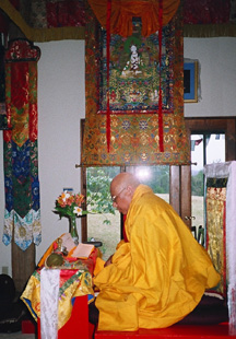 In India, Lama Norlha established several three-year retreat facilities where he trained monks in the complete cycle of transmissions and practices of the Kagyu Lineage. In 1976, at the request of His Holiness the Sixteenth Gyalwang Karmapa and Kalu Rinpoche, Lama Norlha came to New York City where he taught Buddhist philosophy and meditation practices to a wide range of interested students. Two years later, to provide students with the means of studying and practicing at a more profound level of commitment, he founded Kagyu Thubten Chöling Monastery and Retreat Center. Following the sacred example of his own masters, Lama Norlha has dedicated his life to teaching the practices that make up the Kagyupa three-year retreat. To date he has directed four full retreats at Kagyu Thubten Chöling Monastery, while a fifth retreat commenced in October 1999.